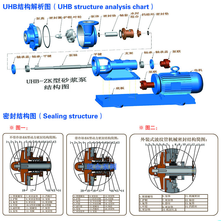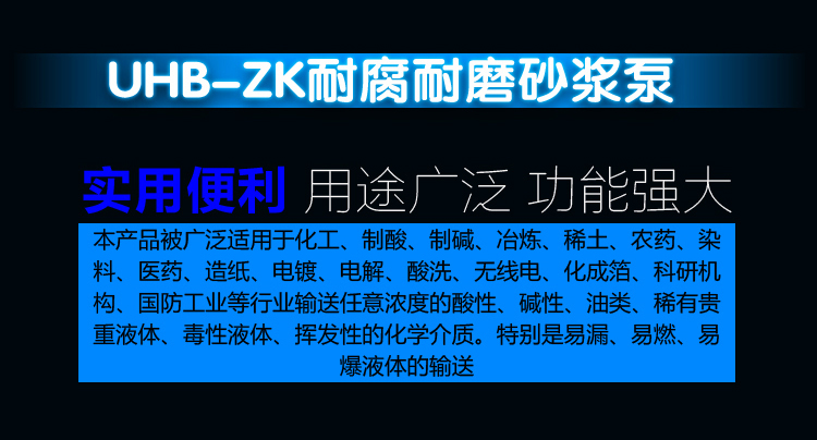 UHB-ZK型系列砂漿泵又稱(chēng)脫硫泵、壓濾機(jī)泵,屬于懸臂式單級(jí)單吸離心泵,是專(zhuān)為輸送含有細(xì)顆粒的腐蝕性介質(zhì)而設(shè)計(jì)開(kāi)發(fā)的,其過(guò)流部件采用鋼襯超高分子量聚乙烯制造,具有較強(qiáng)