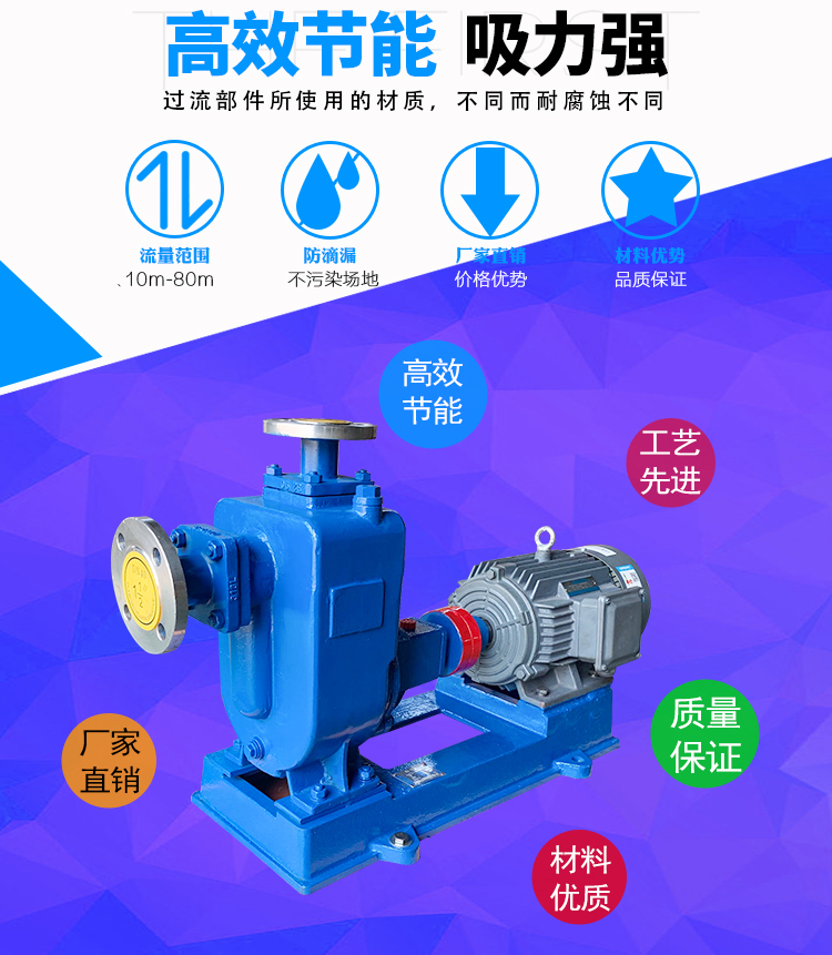 1、該自吸泵屬自吸式自吸泵,它具有結構簡單、操作方便、運行平穩(wěn)、維護容易、效率高、壽命長,具有較強的自吸能力等優(yōu)點。管路中不需底閥,工作前只需保證泵體內儲有定量引油即可。用于油輪或輸水船舶上時,可兼作掃艙泵,掃艙效果良好,