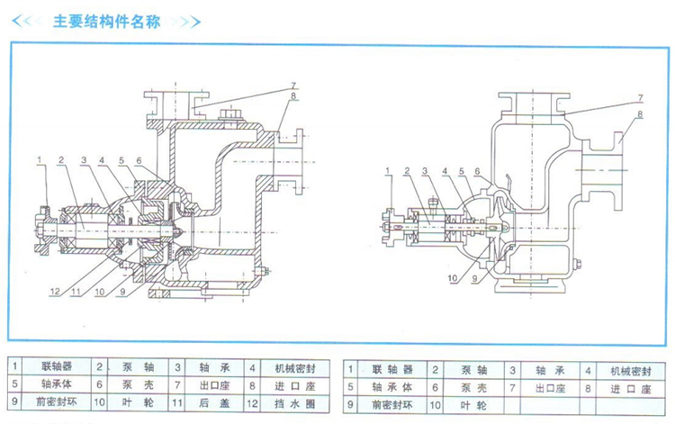 在一些泵的軸承體底部還設有冷卻室。當軸承發(fā)熱引起軸承體溫升超過70度時,可在冷卻室處通過任意一只冷卻液管接頭,注人冷卻液循環(huán)冷卻。泵內部防止液體 由高壓區(qū)向低壓區(qū)泄漏的密封機構是前后密封環(huán),前密封環(huán)裝在泵體上,后密封環(huán)裝在軸承體上,當泵經長期運轉密封環(huán)磨損到一定程度,并影響到水泵的效率及自 吸性能,應給予更換.