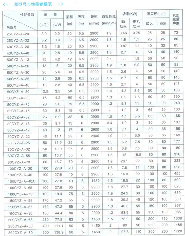 CYZ-A型自吸式自吸泵是 根據國內外有關技術資料經消化、吸收、改進后研制而成的新泵類產品,該自吸泵適用于石油行業(yè)、陸地油庫、油罐車的理想產品,并適合于作船用貨油泵、艙底 泵、消防泵和壓載泵及機器冷卻水循環(huán)等,分別輸送汽油、煤油、柴油、航煤等石油產品和海水、清水,介質溫度-20℃-80℃,如輸送化工液體可改用耐腐蝕 機械密封。